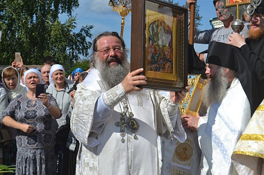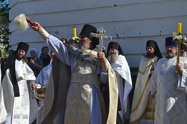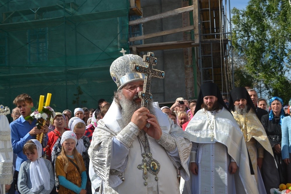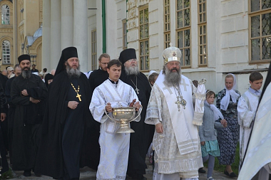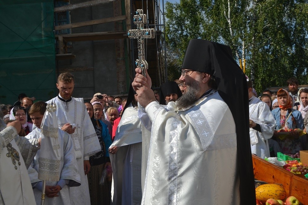 По завершении богослужения был совершен крестный ход вокруг храма, после чего Его Высокопреосвященство поздравил всех собравшихся с праздником и совершил чин освящения урожая.