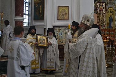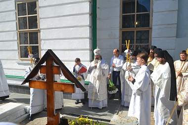 Владыке митрополиту сослужили секретарь правящего архиерея иеромонах Кирилл (Корытко), наместник монастыря игумен Иероним (Миронов) и братия обители в священном сане.