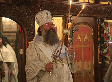 По окончании богослужения правящий архиерей поздравил настоятеля монастыря архимандрита Пимена (Адарченко) с днем тезоименитства и пожелал ему многая лета.