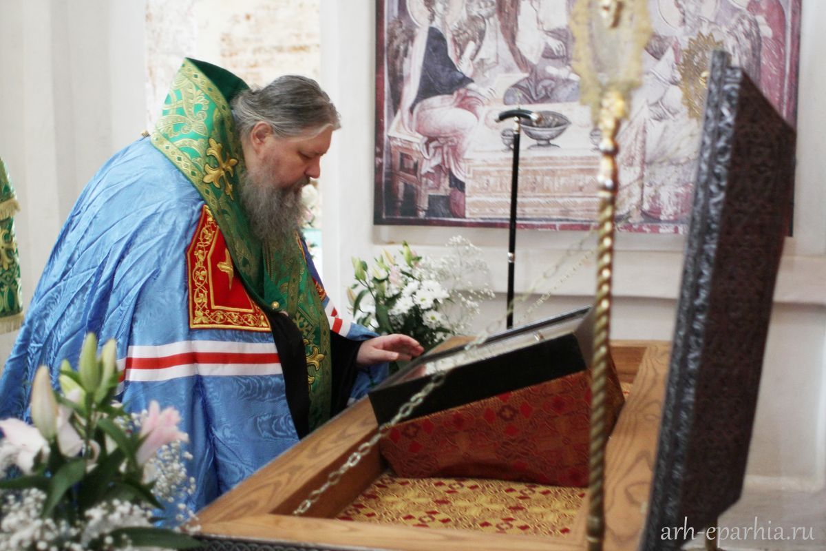 Владыка осмотрел храмы, совершил молебен в Свято-Троицком соборе, где почивают мощи основателя монастыря преподобного Антония Сийского.