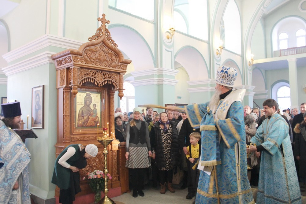 По окончании Литургии совершалось славление праздничного образа. Митрополит Вятский и Слободской Марк окропил верующих святой водой.