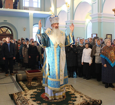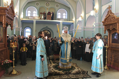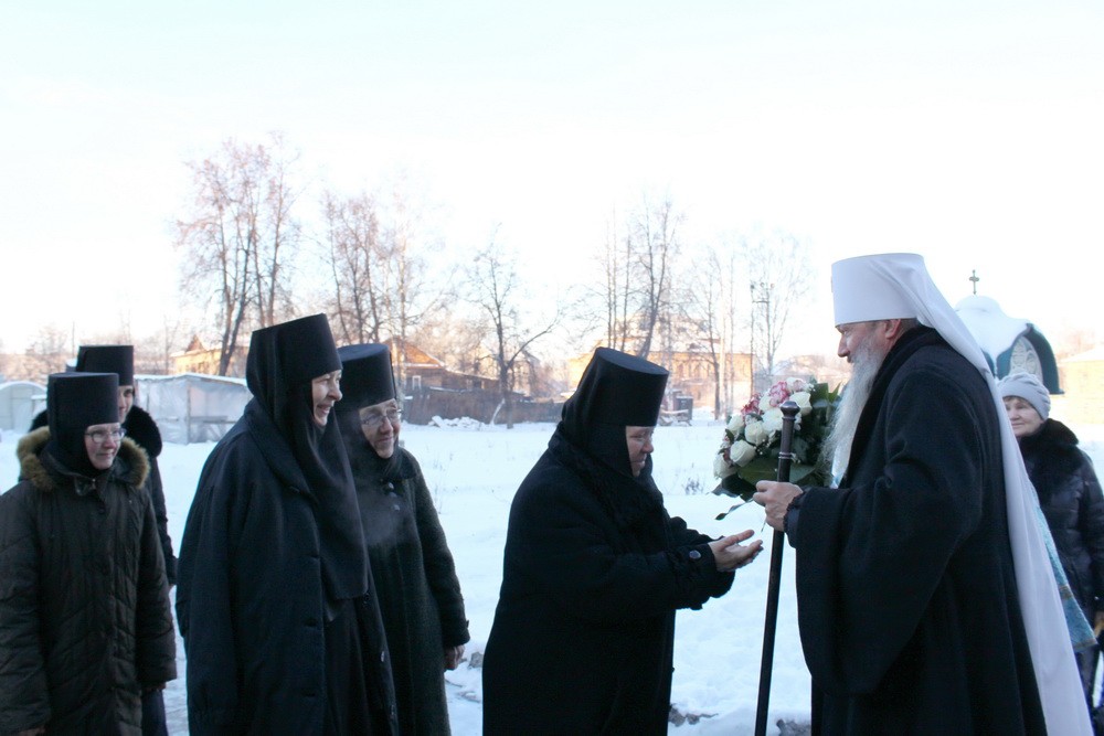 Его Высокопреосвященству сослужили секретарь Вятской епархии иерей Виталий Лапшин, благочинный Слободского благочиния протоиерей Евгений Смирнов, клирики Христорождественского женского монастыря протоиереи Игорь Павлов и Николай Бутюгов, настоятель Екатерининского собора и храма в честь иконы Божией Матери «В скорбех и печалех Утешение» г. Слободского протоиерей Сергий Пентин.