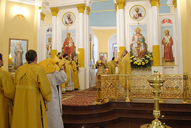 Его Высокопреосвященству сослужили секретарь Вятской епархии иерей Виталий Лапшин, наместник Великорецкого подворья Трифонова монастыря архимандрит Феодор (Рулев), благочинный Свято-Трифонова монастыря игумен Вениамин (Веселов), настоятель Пантелеимоновского храма протоиерей Сергий Ендальцев, клирик подворья Свято-Успенского Трифонова монастыря с. Великорецкого иеромонах Николай (Белев).