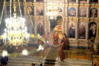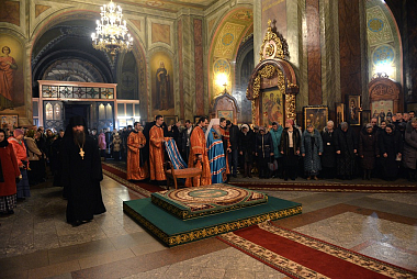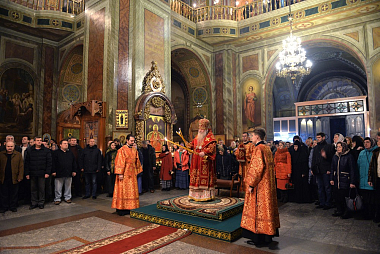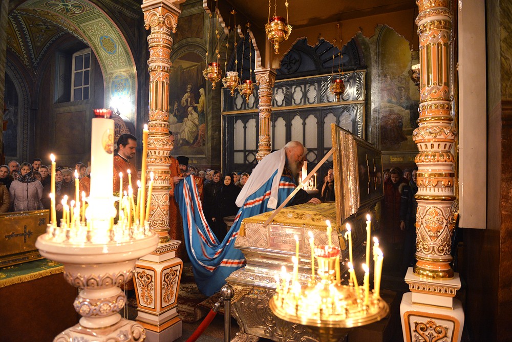 Перед началом богослужения Его Высокопреосвященство поклонился честным мощам святителя Тихона Задонского.