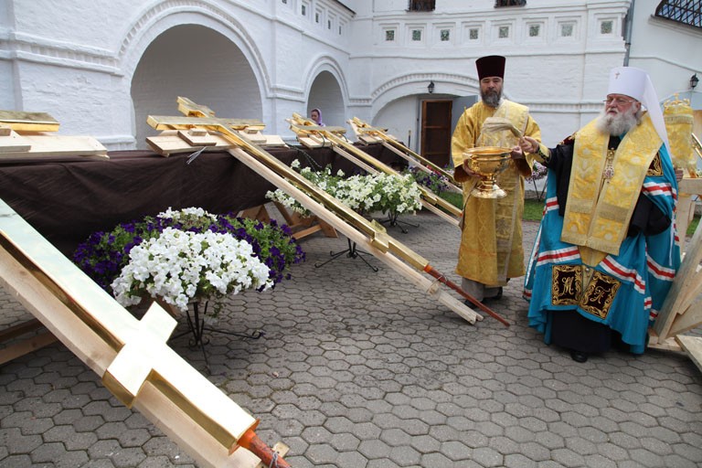 Митрополит Пантелеимон освятил пять крестов. Центральный, самый большой, крест весит 150 килограммов, боковые – около 40 килограммов.