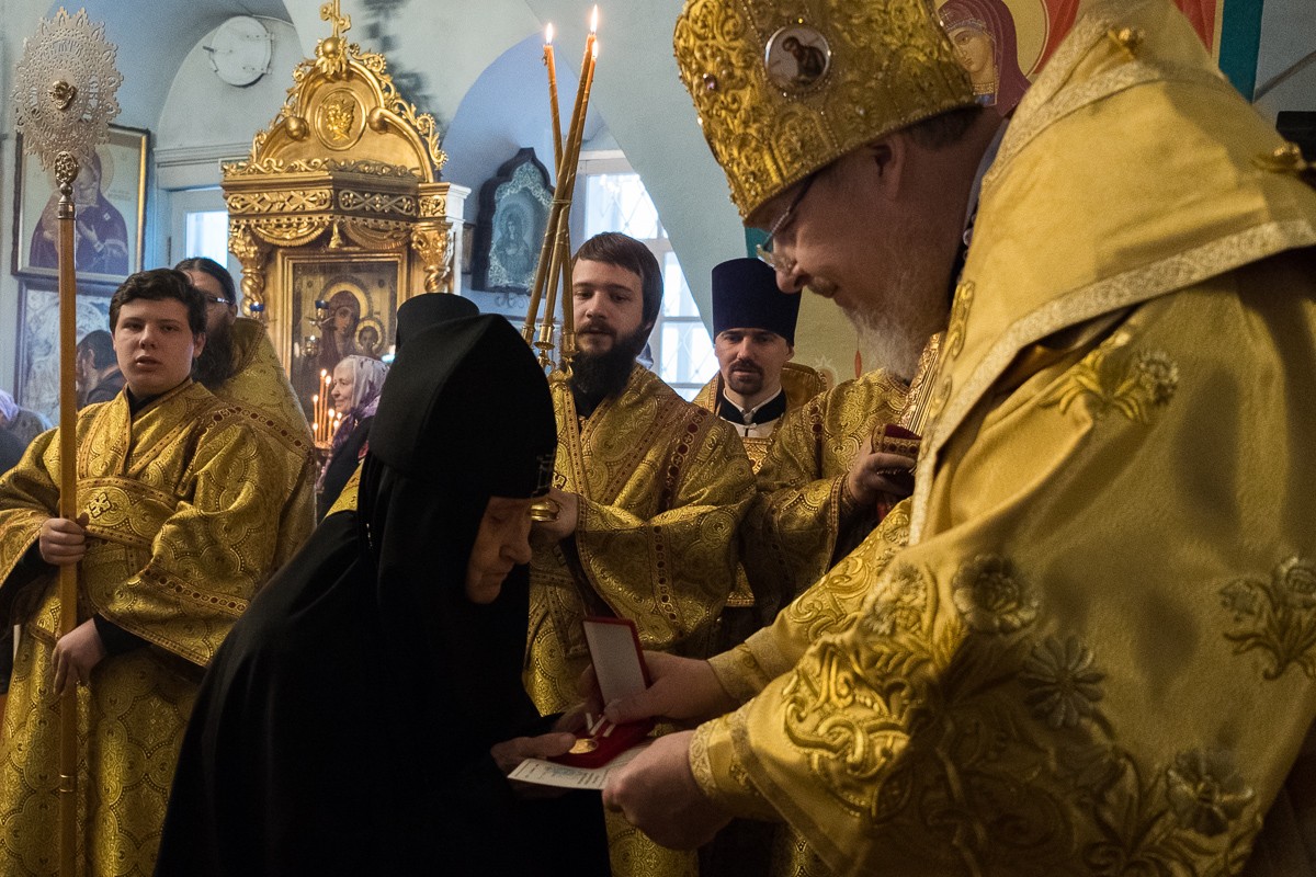По окончании богослужения во внимание к трудам во славу Церкви правящий архиерей вручил матушке Амвросии юбилейную медаль «В честь 100-летия восстановления Патриаршества в Русской Православной Церкви».