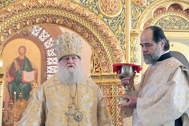 По окончании Божественной литургии епископ Феодор поприветствовал митрополита Пантелеимона: