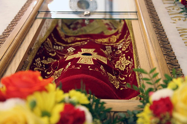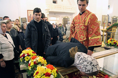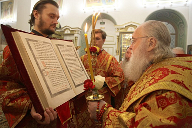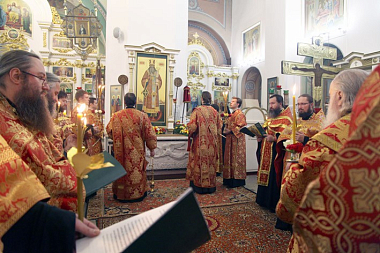 За богослужением перед святыми мощами святителя Агафангела собором духовенства было совершено молебное пение с акафистом.