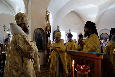 Его Высокопреосвященству сослужили благочинный монастырей и монастырских подворий, председатель Епархиального отдела по монастырям и монашествующим архимандрит Аркадий (Губанов), игумен Борисоглебской обители иеромонах Арсений (Леонов), руководитель службы протокола Тверской епархии протоиерей Александр Любавин, заместитель службы протокола Тверской епархии иеромонах Агапит (Евдокимов), благочинный II-го Калининского благочиннического округа иерей Кирилл Алексеев, духовенство святой обители и клирики Тверской епархии.