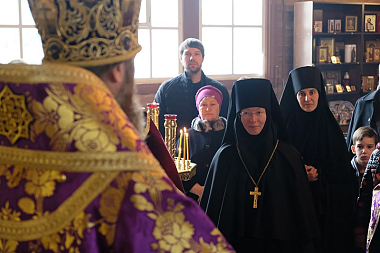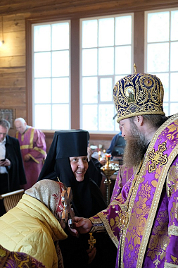 По окончании богослужения от лица насельниц и прихожан святой обители со словами благодарности к Высокопреосвященнейшему Савве обратилась игумения София (Прощаева).