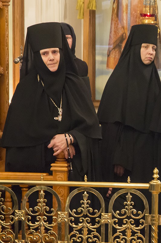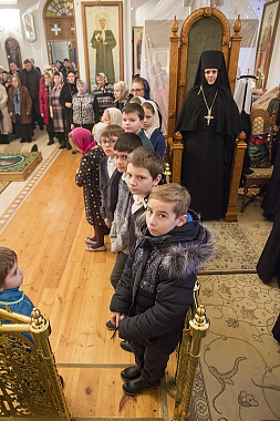 Преображенский соборный храм обители был заполнен молящимися. На богослужение в этот праздничный воскресный день собрались все монашествующие сестры и послушницы монастыря, а также многочисленные паломники. У левого клироса чинно расположилась большая группа детей – воспитанников монастырской Воскресной школы. Особый благоговейный молитвенный настрой придавало богослужению стройное пение монастырского хора сестер и послушниц святой обители.