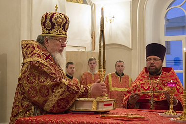 По завершении проповеди Его Высокопреосвященство поздравил настоятельницу обители игумению Варвару с днем тезоименитства и вручил в дар икону Христа Спасителя.