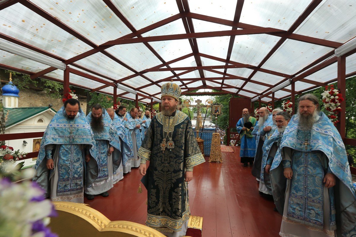 На следующий день в монастыре была совершена Божественная литургия, которую возглавил митрополит Псковский и Порховский Тихон. Это была первая Божественная литургия, совершенная Его Высокопреосвященством в качестве священноархимандрита и игумена Псково-Печерской обители. Высокопреосвященнейшему Тихону сослужила братия Печерского монастыря, а также прибывшие на торжество насельники Сретенского ставропигиального монастыря Москвы в священном сане. За богослужением молились игумении монастырей Псковской епархии с сестрами, многочисленные паломники. На престольном празднике присутствовал временно исполняющий обязанности губернатора Псковской области Михаил Ведерников.