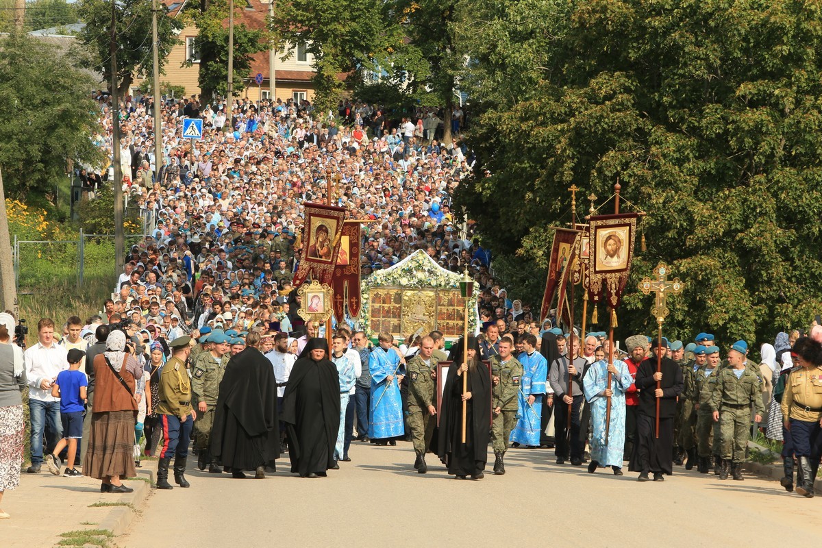 По окончании Литургии владыка Тихон обратился к присутствующим с архипастырским словом. Поздравив молившихся, Его Высокопреосвященство сказал о значении в нашей жизни Божией Матери как великой заступницы рода человеческого. Затем состоялся традиционный праздничный крестный ход с древним чудотворным образом Успения.