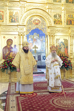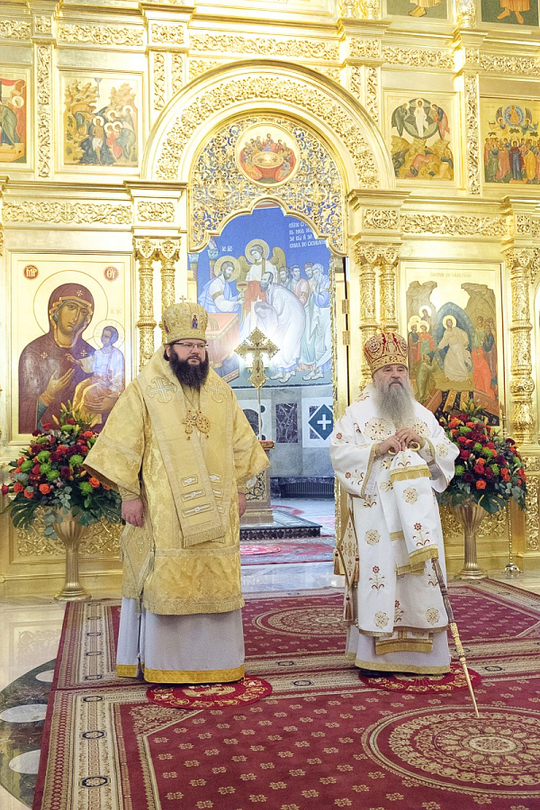 Его Высокопреосвященству сослужили митрополит Смоленский и Дорогобужский Исидор, а также секретарь епархиального управления протоиерей Сергий Куксевич, протоиереи Богдан Сойко, Василий Стойков, Геннадий Бартов, Владимир Сорокин, Виктор Московский, Геннадий Зверев, Алексий Исаев, клирики обители и другие священнослужители.