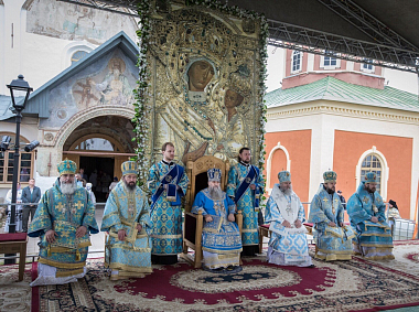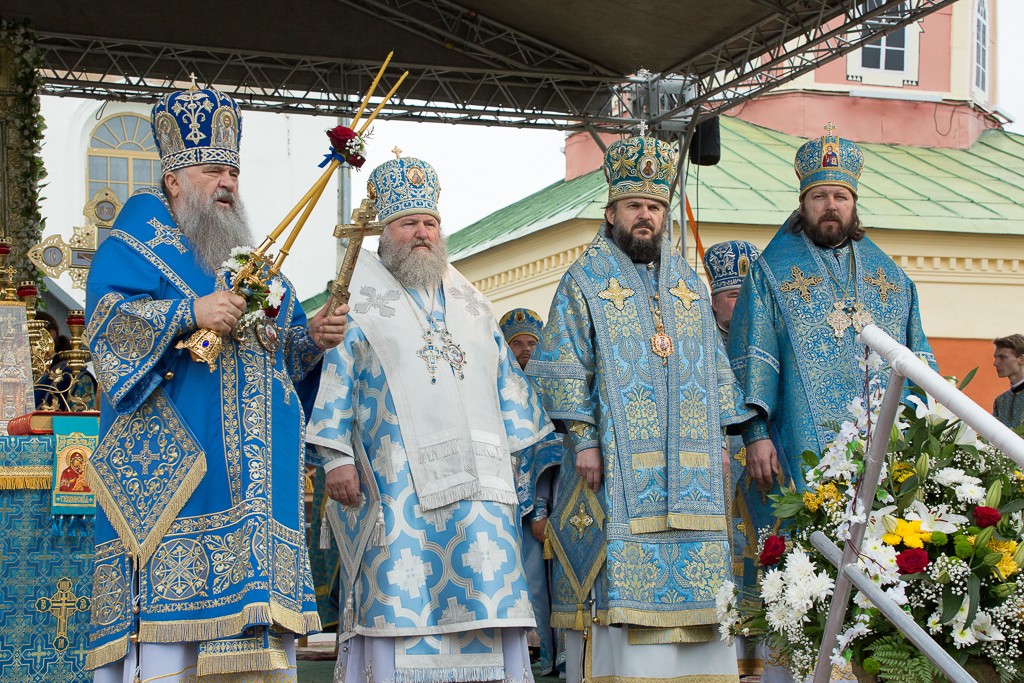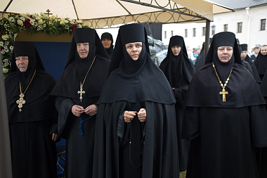 За богослужением молились настоятельницы и насельницы женских монастырей митрополии, паломники, участники крестного хода по местам явления Тихвинской иконы Божией Матери «Путь Богородицы».
