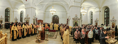 Богослужебные песнопения исполнили митрополичий хор (регент Константин Михайлов) и хор Иоанно-Богословского мужского монастыря под управлением монаха Прохора (Пожарницкого).