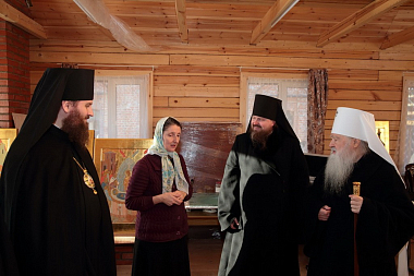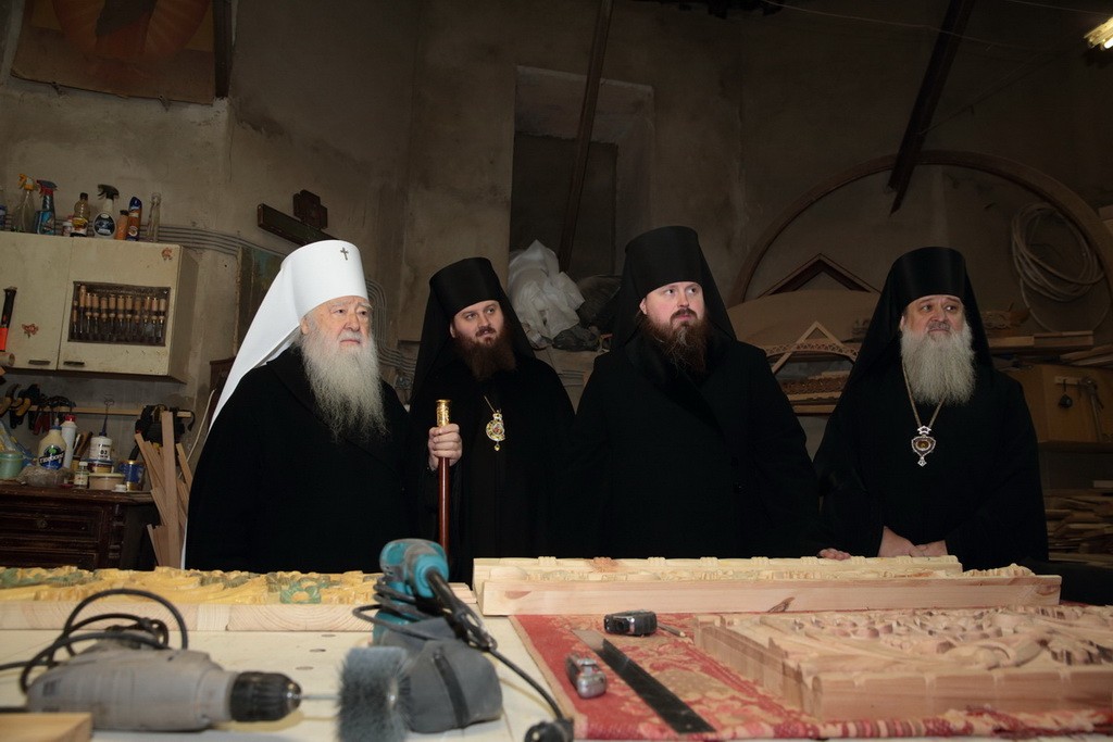 Затем владыка Ювеналий посетил иконописную и столярную мастерские монастыря. Руководитель творческой мастерской Наталия Устинова познакомила митрополита и высоких гостей с ходом работ по написанию икон и изготовлению резных элементов для нового иконостаса Преображенского собора. Его Высокопреосвященству также представили макет росписи монастырского собора – дипломный проект выпускницы Православного Свято-Тихоновского гуманитарного университета Александры Хонеевой.