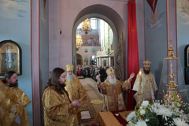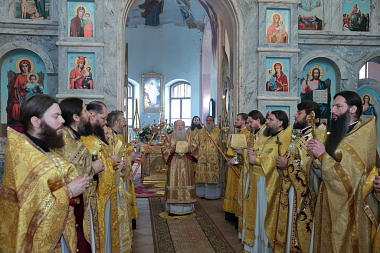 Его Высокопреосвященство возглавил Божественную литургию в Преображенском соборе обители и возвел в сан игумена ее нового настоятеля иеромонаха Серафима (Голованова), назначенного на эту должность Святейшим Патриархом и Священным Синодом 22 октября 2015 года.