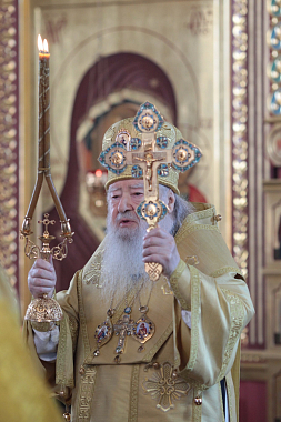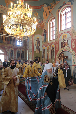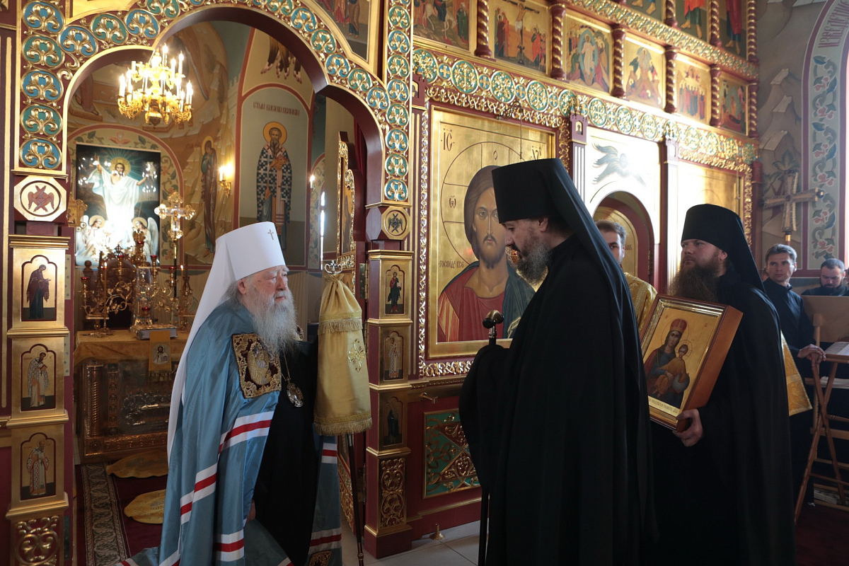 В свою очередь, игумен Алексий (Горлычев) обратился к владыке с благодарственным словом и преподнес Его Высокопреосвященству образ Божией Матери «Прежде Рождества и по Рождестве Дева», почитаемый в Николо-Пешношском монастыре.
