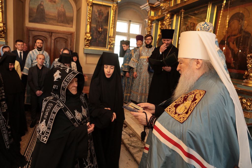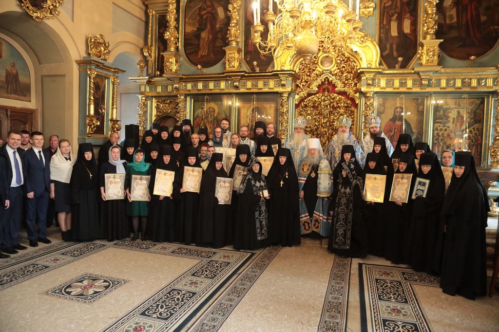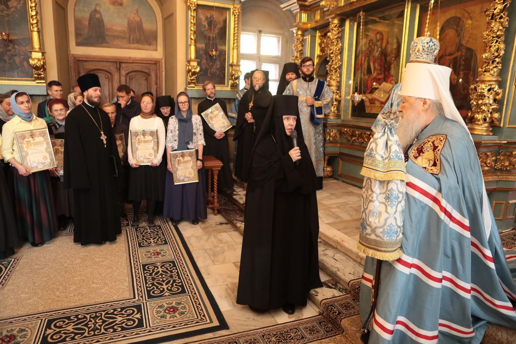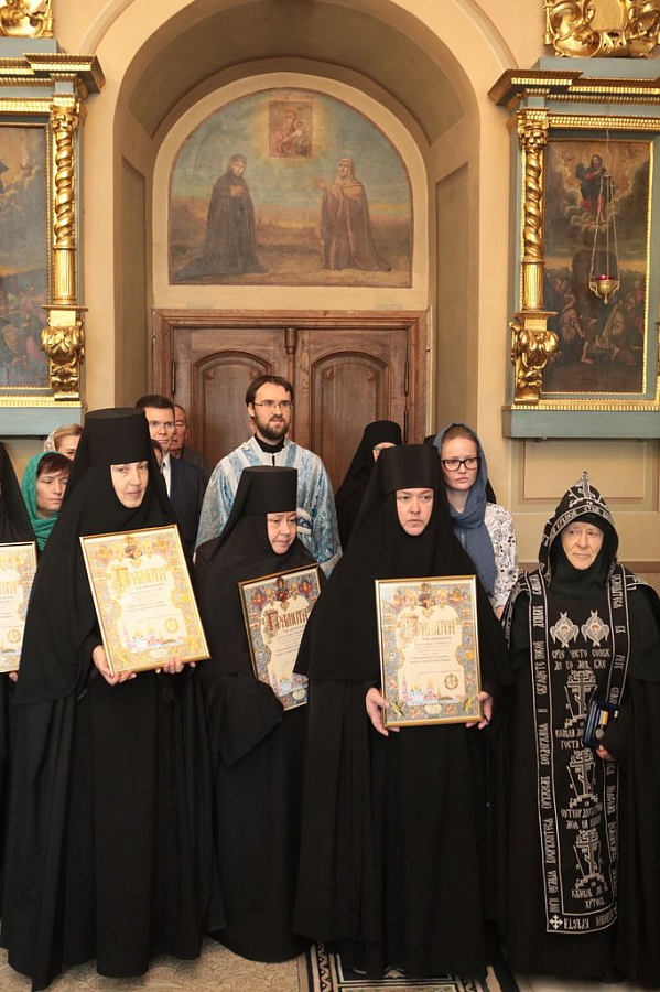 Митрополит Ювеналий вручил насельницам Новодевичьей обители награды Московской епархии, которых они были удостоены в связи с 25-летием монастыря и во внимание к усердным трудам на благо Церкви Христовой: настоятельнице монастыря игумении Маргарите (Феоктистовой) – медаль «За жертвенные труды» II степени; схимонахине Елене (Головкиной) – медаль «За жертвенные труды» III степени; схимонахине Серафиме (Гречиной) – медаль «За усердное служение» III степени. Благодарственных и благословенных грамот митрополита Ювеналия были удостоены особо потрудившиеся насельницы обители и сотрудники монастыря.