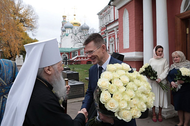 «Ваше Высокопреосвященство дорогой владыка! Примите наши искренние поздравления в связи с 25-летием Новодевичьего монастыря. Всего лишь пять лет отделяет нас от того дня, когда все мы будем торжественно праздновать 500-летний юбилей нашей обители. Мы сердечно просим, чтобы Вы особо молились о нас, потому что эти годы самые ответственные и тяжелые. К 2024 году завершатся ремонтно-реставрационные работы в монастыре и наш монастырь будет величественным, как и прежде. Дорогой владыка, мы желаем Вам многая и благая лета!»