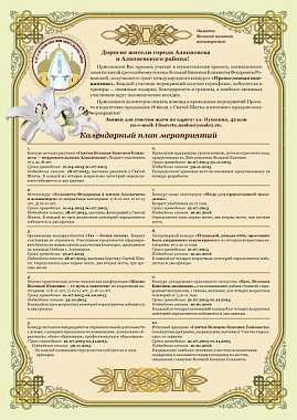 Проект направлен на создание условий по вовлечению образовательных, социальных, культурных организаций, Церкви, общественности г. Алапаевска и Алапаевского района в совместную практическую деятельность по духовно-нравственному воспитанию на примере подвига Великой княгини Елисаветы Феодоровны и инокини Варвары.