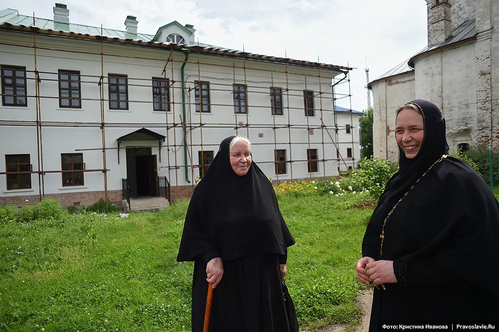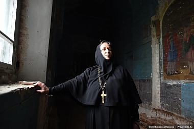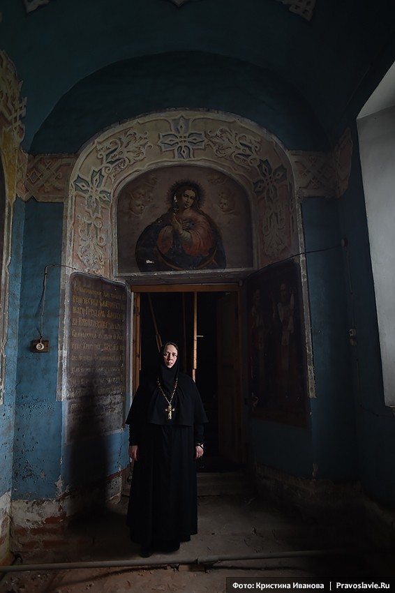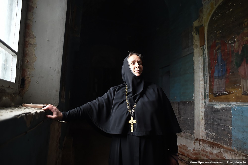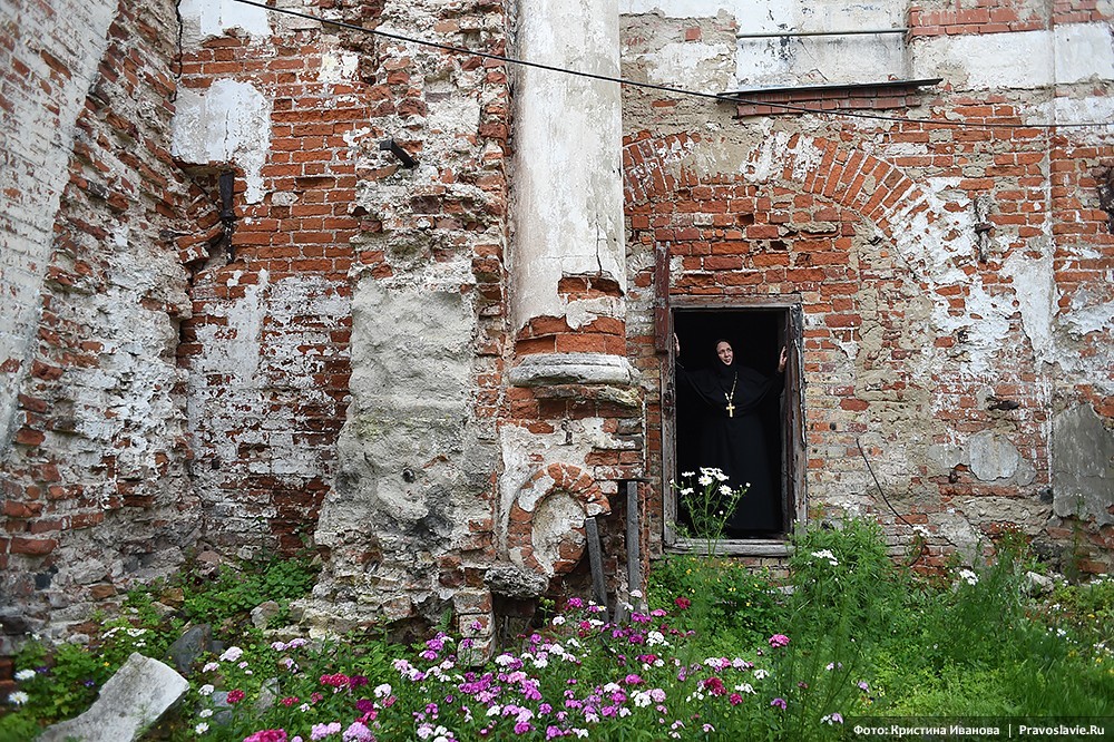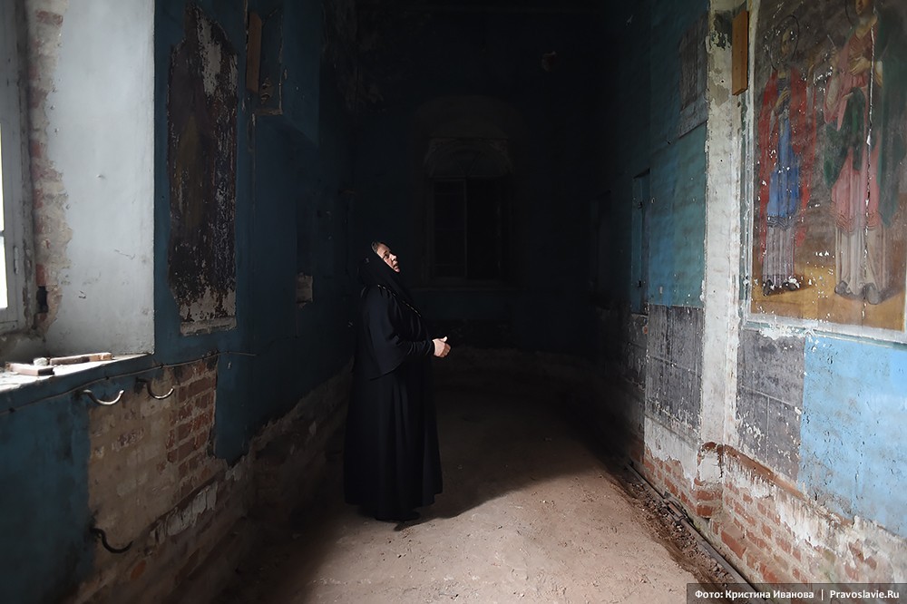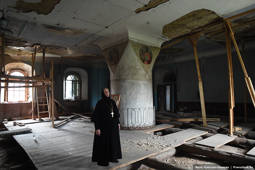«Если нас застигнет последний день, то представляете, в чем Господь нас застанет? Мы взяли в руки кирпич и собираемся его положить в храм», ‒ рассказывает настоятельница обители игумения Афанасия (Силкина). – Корпуса были в ужасающем состоянии. Жить можно было только в игуменском. Ограды у монастыря не было, вместо дороги – рытвины. Люди сюда не ходили. Не было ни водо-, ни газопровода, на территории – разруха, мусор, завалы; земельный участок не оформлен в собственность монастыря, здания не переданы, нет проектной документации.