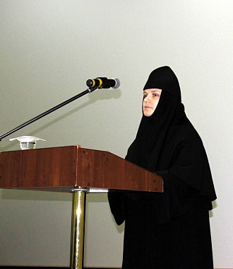 Монахиня Никона (Афанасьева), насельница Свято-Тихоновского Преображенского женского монастыря, выступила с докладом «Монашество как путь восхождения к Богу», посвященным святоотеческому учению о монашеских обетах.