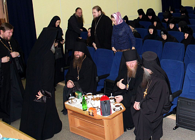 Архимандрит Феофилакт (Безукладников), наместник Ново-Иерусалимского Воскресенского ставропигиального монастыря, представитель Синодального отдела по монастырям и монашеству, по благословению председателя Отдела архиепископа Сергиево-Посадского Феогноста приехавший поделиться опытом с монашествующими Липецкого края, обратился к собравшимся со словом приветствия и изложил некоторые принципы соборного делания, на основе которого священноначалие Русской Церкви разрабатывает «Положение о монастырях и монашестве».