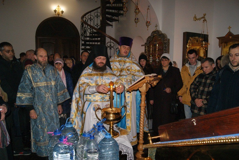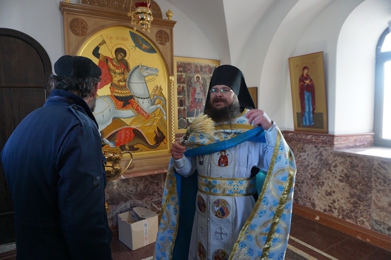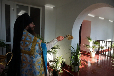После молебна на освящение воды в сочельник иеромонах Вениамин окропил крещенской водой все монастырские водоемы и все помещения.