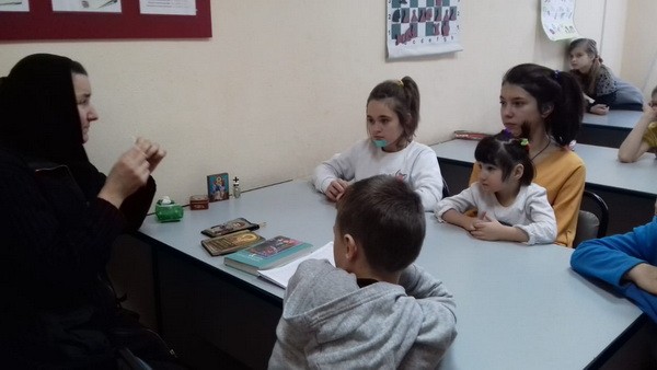 Вторую часть занятия инокиня Фотиния предложила детям обсудить вопрос, почему некоторые люди дарят нам радость, даже возможно вопреки своим проблемам и скорбям, а другие будто специально пытаются навредить ближним и как следует реагировать на это.