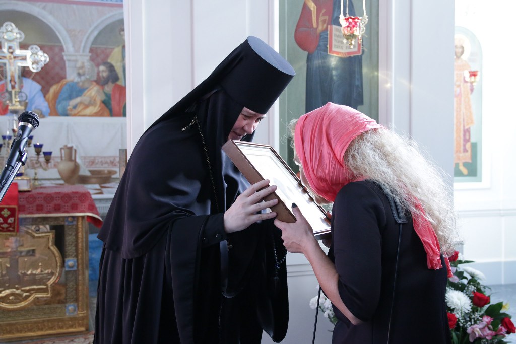 В благодарность за жертвенное служение и многолетнюю поддержку мам, попавших в трудную жизненную ситуацию, игумения София вручила помощникам приюта Наталье Кирилловой и Елене Павловой иконы Пресвятой Богородицы.