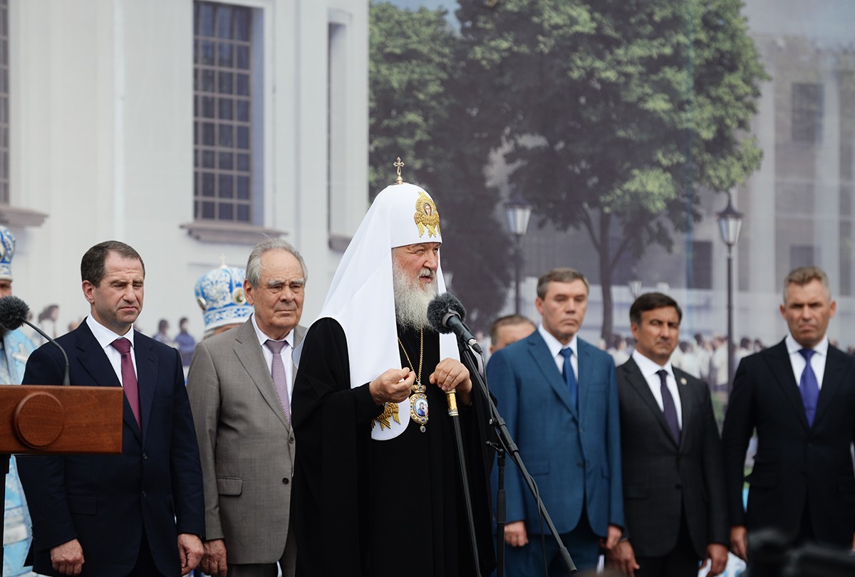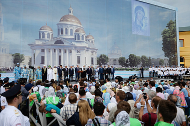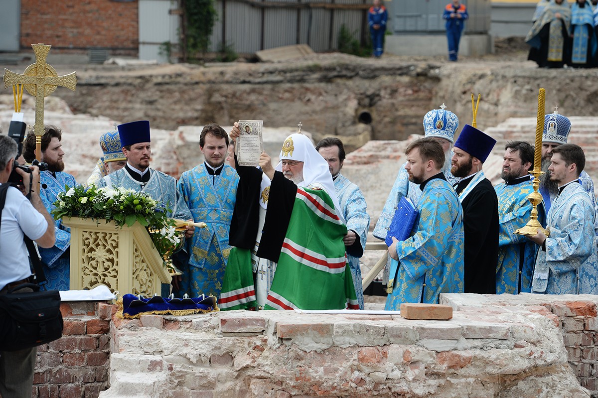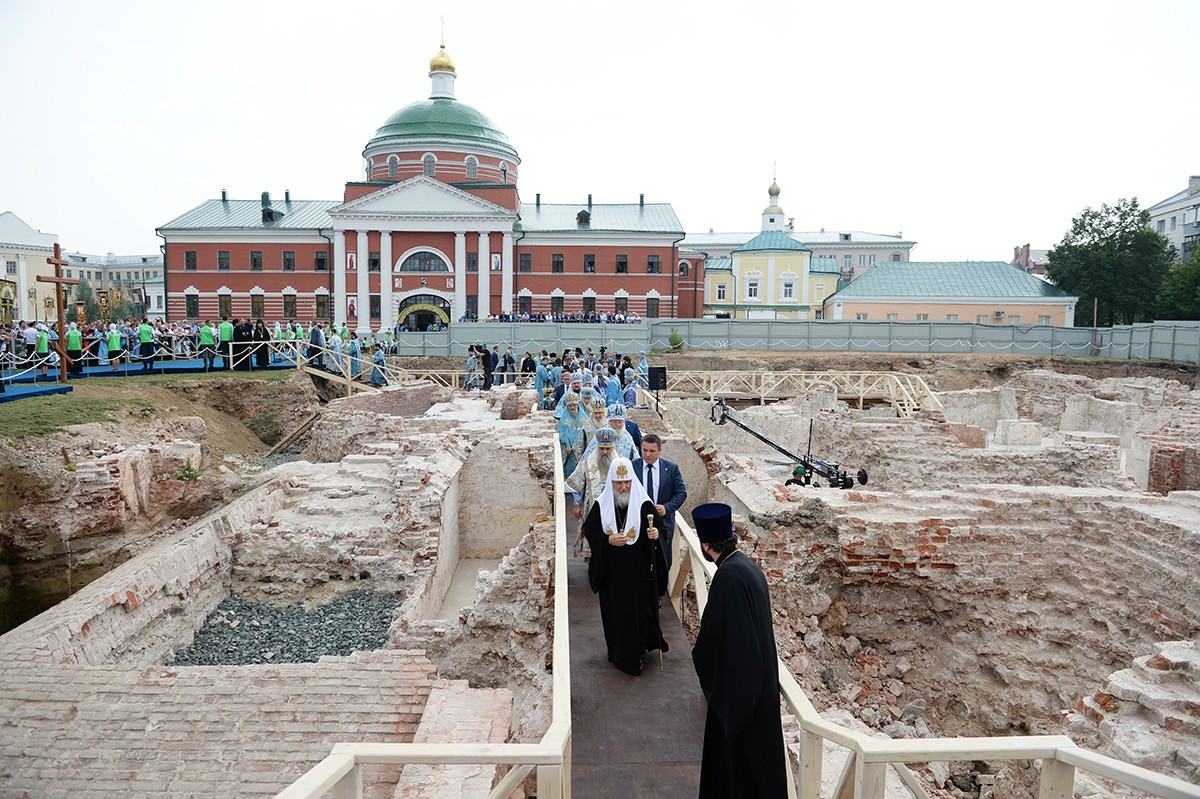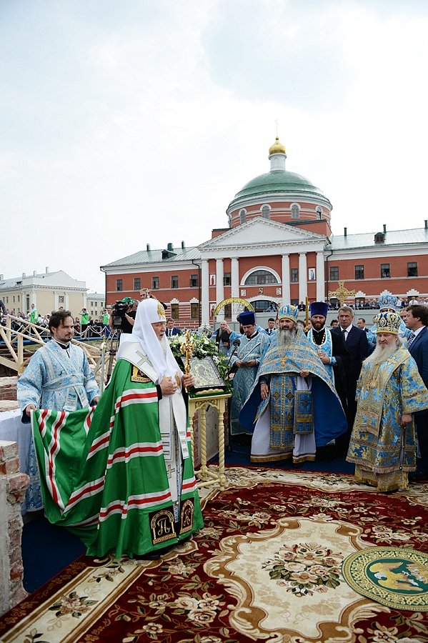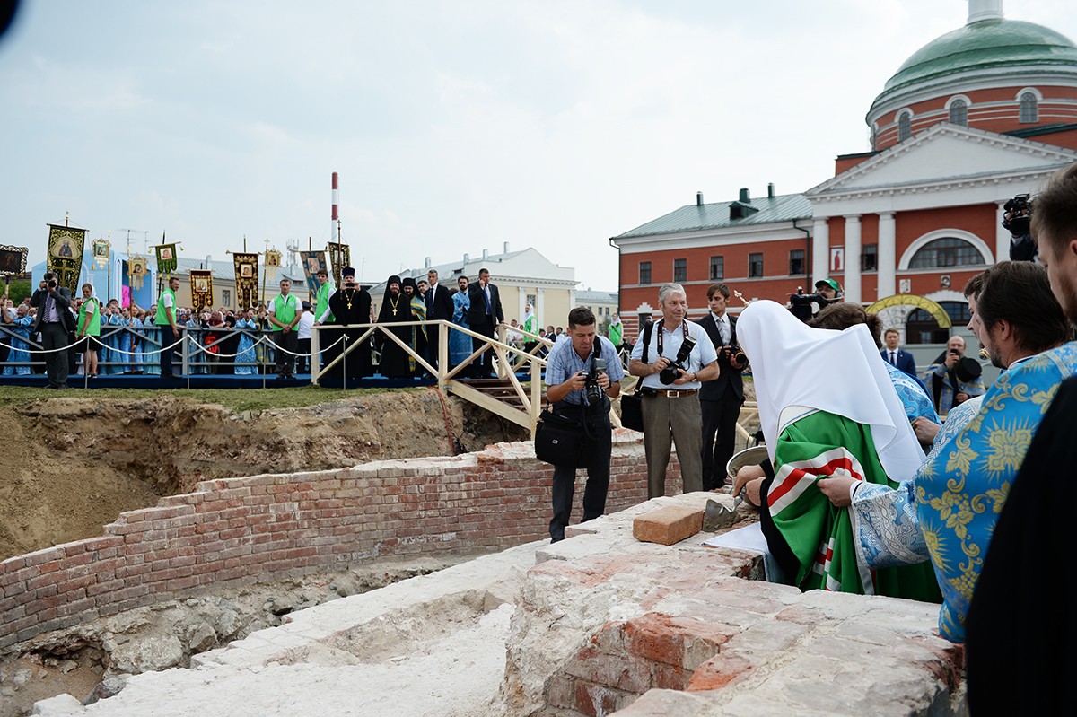 По прибытии крестного хода в Богородицкий монастырь Святейший Патриарх Московский и всея Руси Кирилл совершил чин закладки восстанавливаемого исторического собора Казанской иконы Божией Матери.
