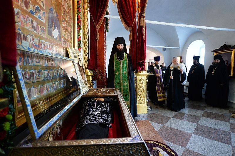 Затем Святейший Владыка поклонился честным мощам прп. Александра Свирского, покоящимся в Спасо-Преображенском соборе, после чего направился на территорию Троицкого комплекса монастыря, где возглавил служение Божественной литургии свт. Василия Великого в соборе Живоначальной Троицы.