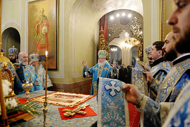По завершении Литургии Святейший Патриарх совершил славление и прочитал молитву у чудотворного списка Иверской иконы Божией Матери.