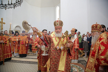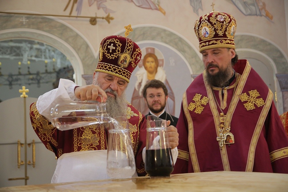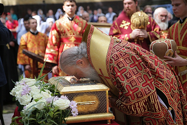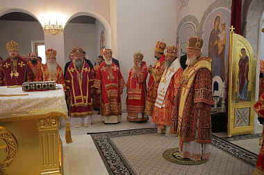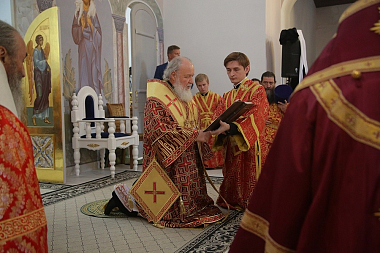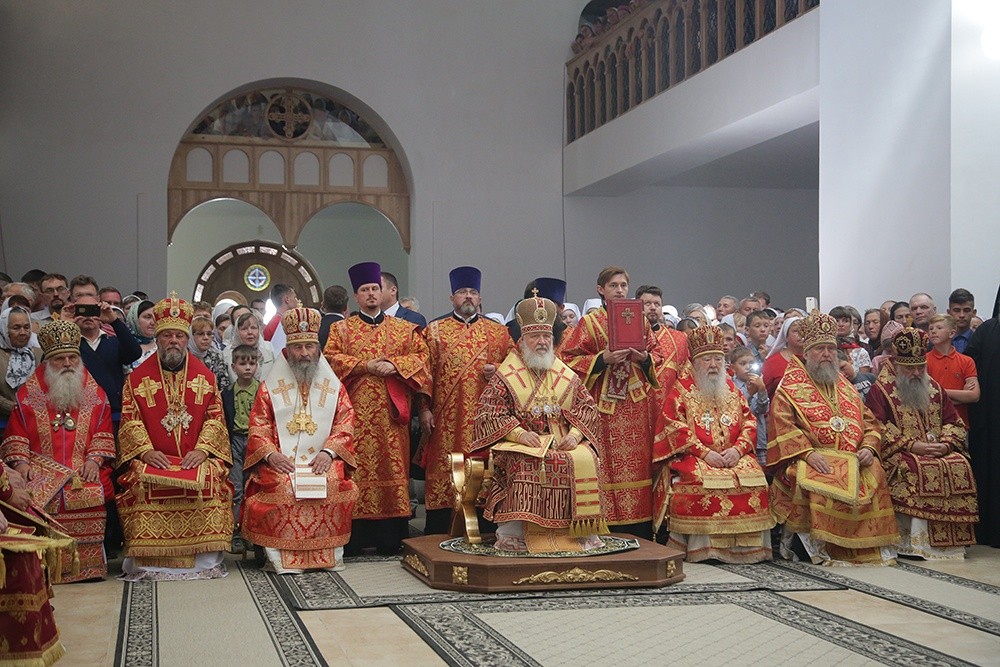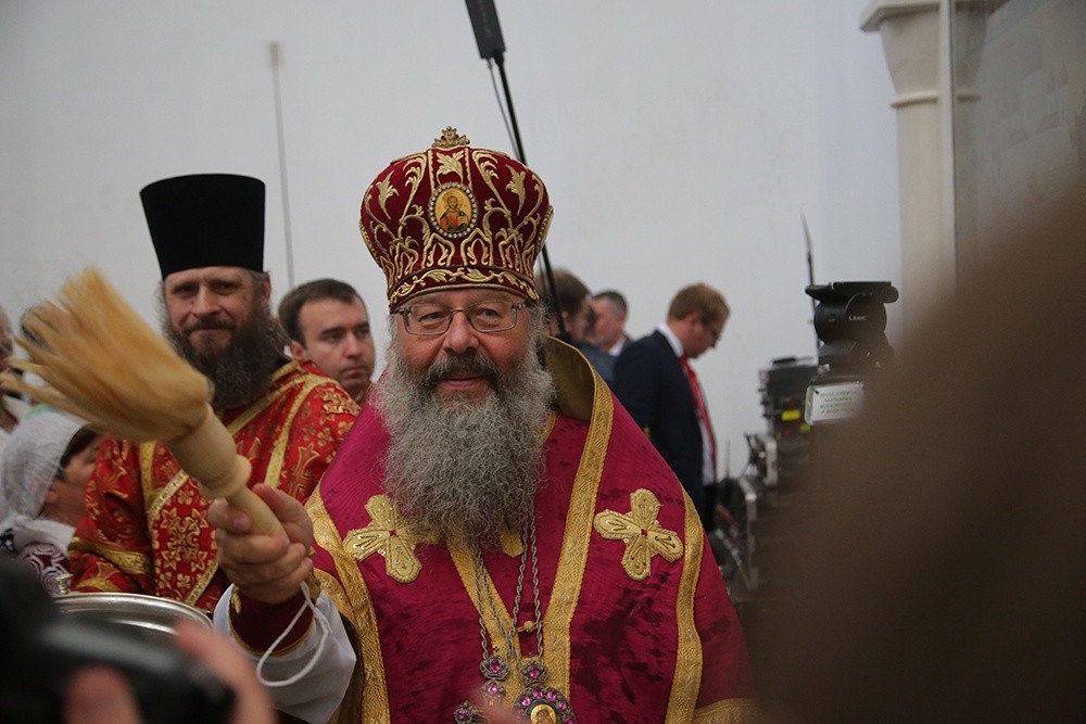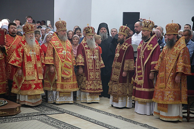 Затем Святейший Владыка приветствовал архипастырей, наместника монастыря игумена Моисея с братией, духовенство Екатеринбургской митрополии.