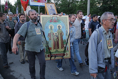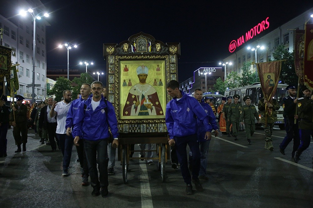 По традиции шествие совершалось с хоругвями и иконами, в том числе с двухметровой иконой императора Николая II, созданной в 2017 году для храма в честь иконы Божией Матери «Державная» на Ганиной Яме. Вес иконы с киотом – около 150 кг. Так как икона очень тяжелая, для ее перемещения были изготовлены специальные носилки на колесах.
