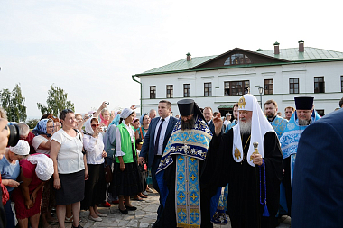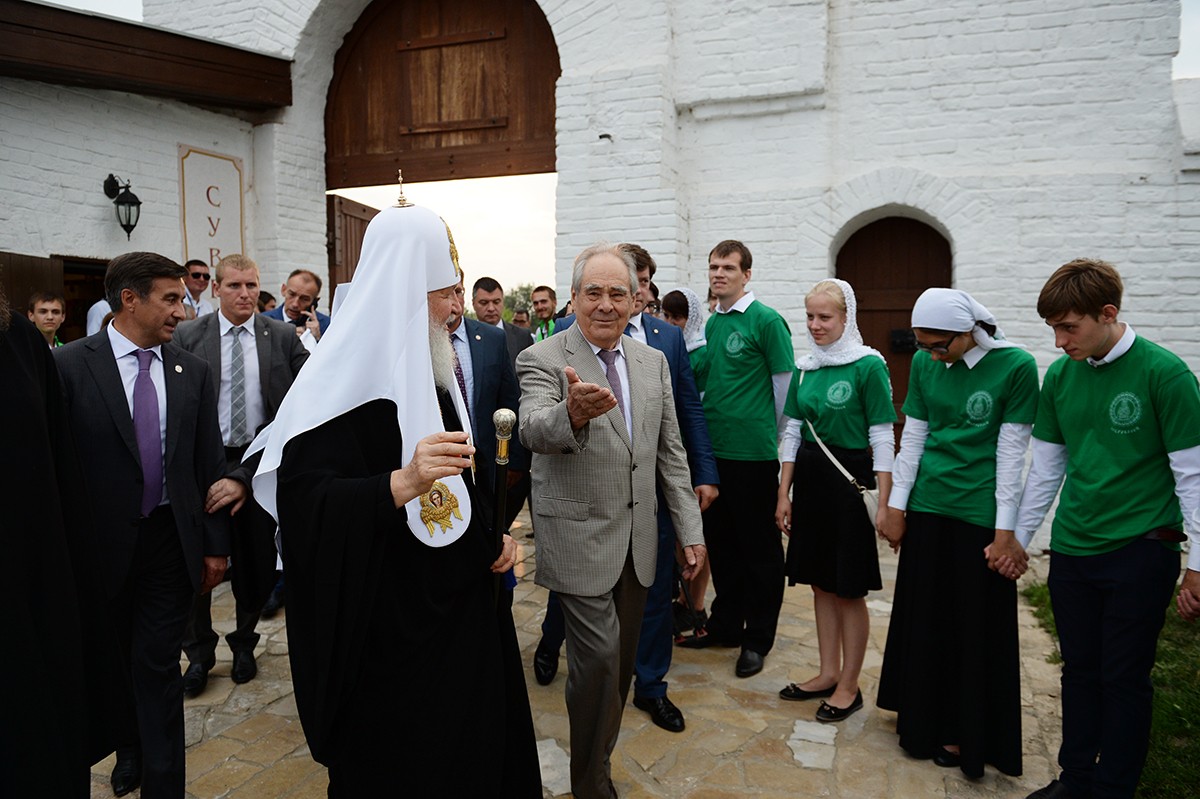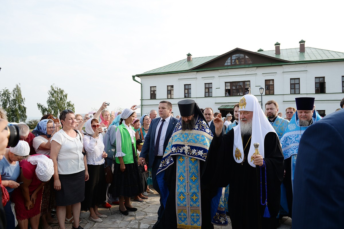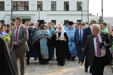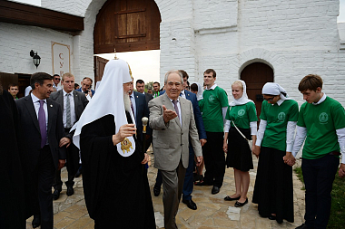 Святейшего Владыку сопровождали государственный советник Республики Татарстан М.Ш. Шаймиев, митрополит Казанский и Татарстанский Феофан, настоятель Свияжского монастыря игумен Силуан (Хохиашвили).