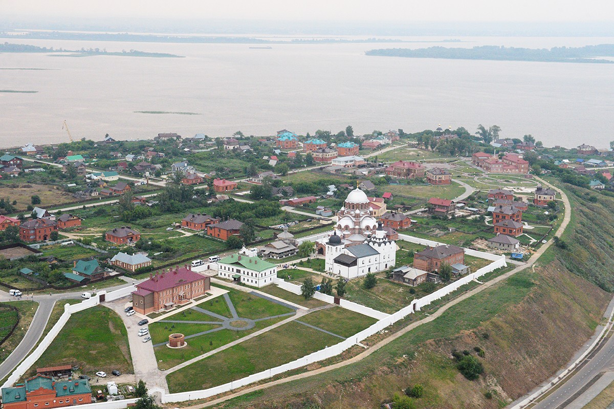 Свияжский собор в честь иконы Божией Матери «Всех скорбящих Радость» построен в 1898–1906 годах по проекту казанского епархиального архитектора Ф.Н. Малиновского на средства из епархиальной казны и добровольные пожертвования. В 1914 году собор был расписан внутри, работы производились на средства московского фабриканта С.С. Мечникова.
