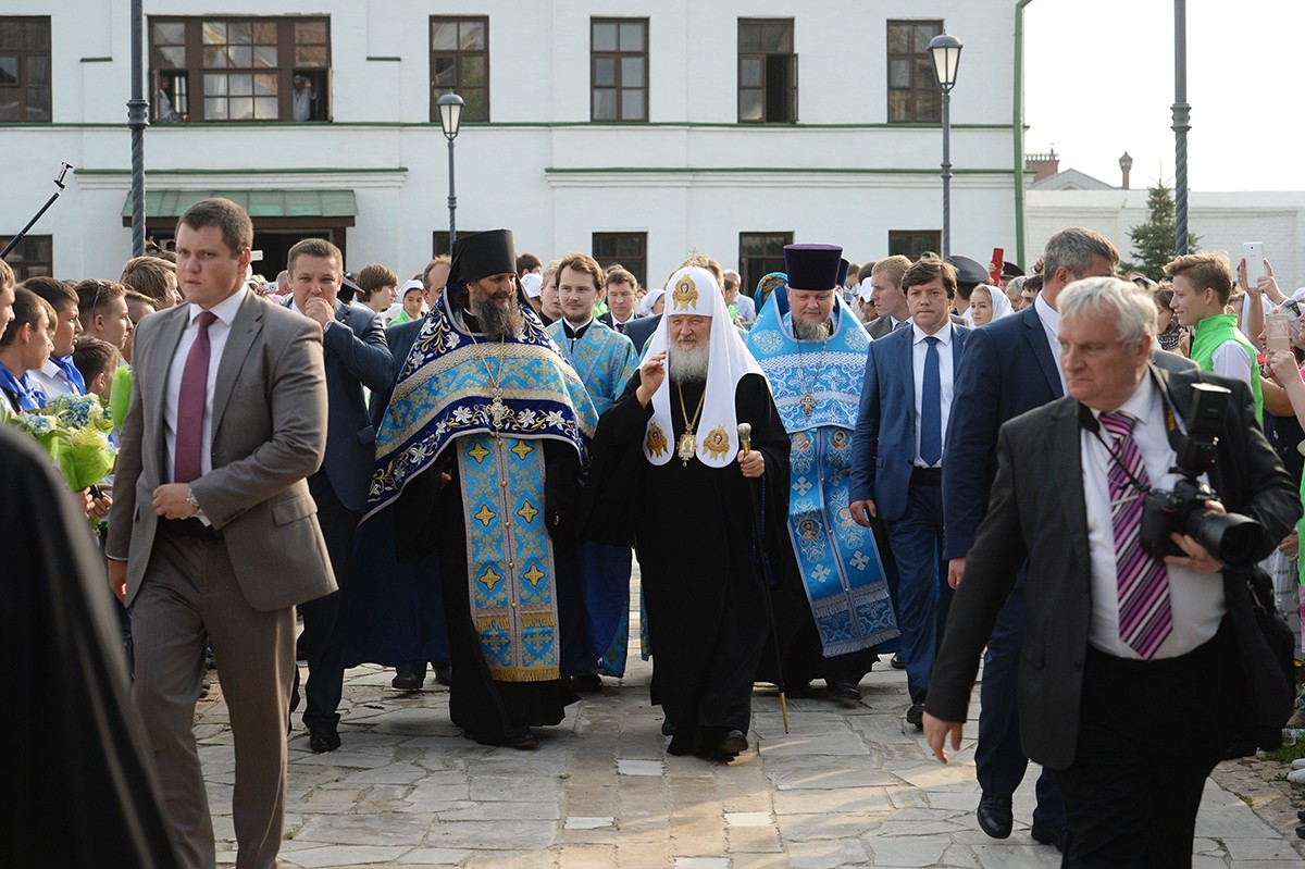 Его Святейшеству сослужили: митрополит Санкт-Петербургский и Ладожский Варсонофий, управляющий делами Московской Патриархии; митрополит Чебоксарский Чувашский Варнава; митрополит Уфимский и Стерлитамакский Никон; митрополит Казанский и Татарстанский Феофан; митрополит Нижегородский и Арзамасский Георгий; архиепископ Берлинско-Германский и Великобританский Марк; архиепископ Йошкар-Олинский и Марийский Иоанн; епископ Солнечногорский Сергий, руководитель Административного секретариата Московской Патриархии; епископ Альметьевский и Бугульминский Мефодий; епископ Чистопольский и Нижнекамский Пармен; протоиерей Владимир Самойленко, секретарь Казанской епархии, настоятель храма Рождества Христова г. Казани; игумен Силуан (Хохиашвили), настоятель Успенского монастыря в Свияжске; протоиерей Владимир Вигилянский, настоятель храма Св. мц. Татианы при МГУ г. Москвы; священник Димитрий Сафонов, секретарь ОВЦС по межрелигиозным отношениям, исполнительный секретарь Межрелигиозного совета России; духовенство Татарстанской митрополии.