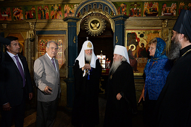 Затем Святейший Патриарх Кирилл посетил деревянную Троицкую церковь Свияжска, являющуюся древнейшим сохранившимся православным храмом на территории Татарстана. Храм был построен в 1551 году одновременно с крепостью Свияжск.