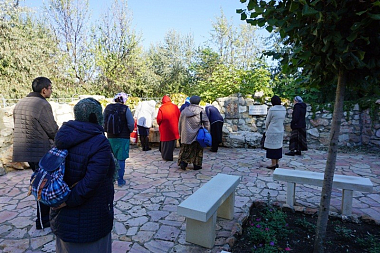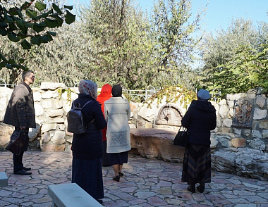 Очень заинтересовал гостей рассказ о воссозданной на территории подворья Кубанской Гефсимании, евангельских событиях в Гефсиманском саду (не все читали Евангелие и о роли Гефсиманского сада в истории человечества некоторые узнали впервые). Гости долго молились у барельефа «Моление о Чаше» (точную копию этого иерусалимского барельефа выполнил для монастыря «Всецарица» в 2013 году белорусский скульптор Эдуард Астафьев).