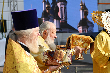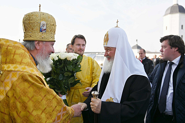 По окончании Литургии митрополит Брянский и Севский Александр приветствовал Святейшего Владыку и преподнес Его Святейшеству крест и две панагии с изображением Свенской иконы Божией Матери и образа Спаса Нерукотворного.