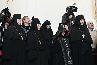 На телеканале «Союз» шла прямая трансляция Патриаршего богослужения. Часть верующих, не попавших в переполненный храм, следила за трансляцией на больших экранах, установленных на территории монастыря.