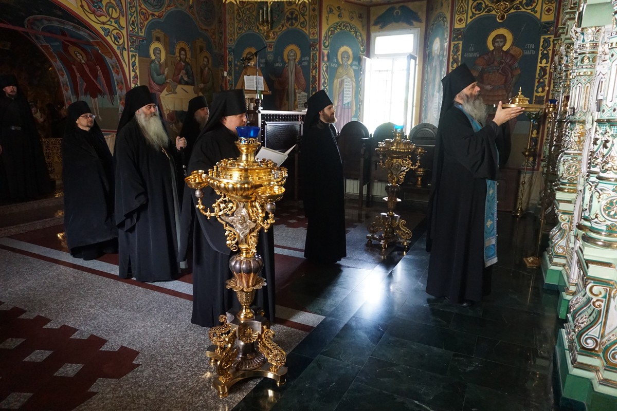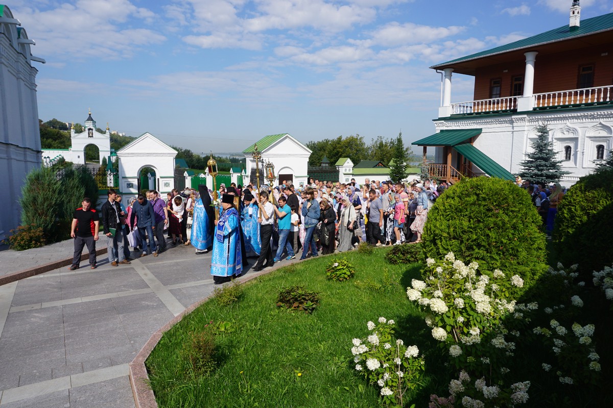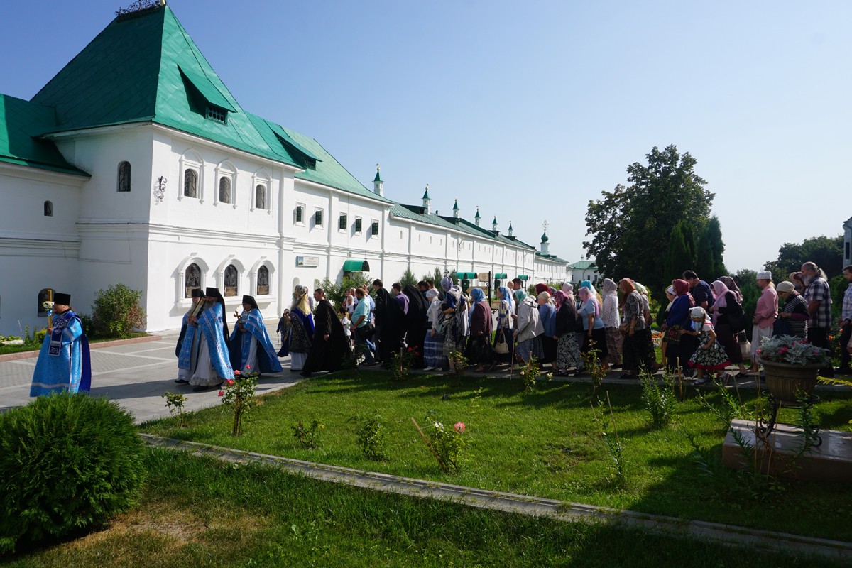 Под колокольный звон многочисленные прихожане и паломники, окропляемые святой водой, обошли храмы обители. При возвращении в Успенскую церковь вместе с народом было пропето песнопение «Царице Моя Преблагая…» По окончании крестного хода братия монастыря во главе с игуменом проследовали в братскую трапезную, где был совершен «Чин о Панагии».