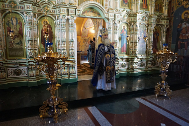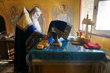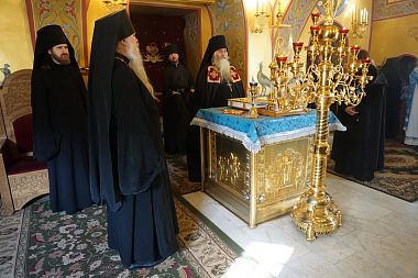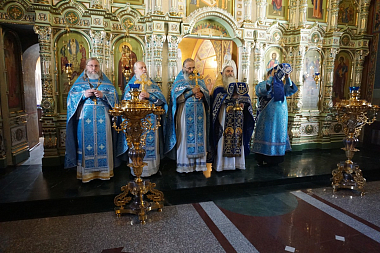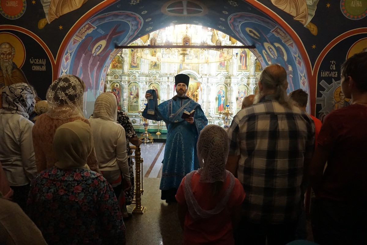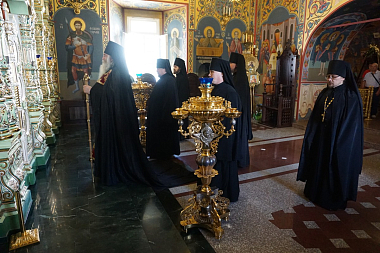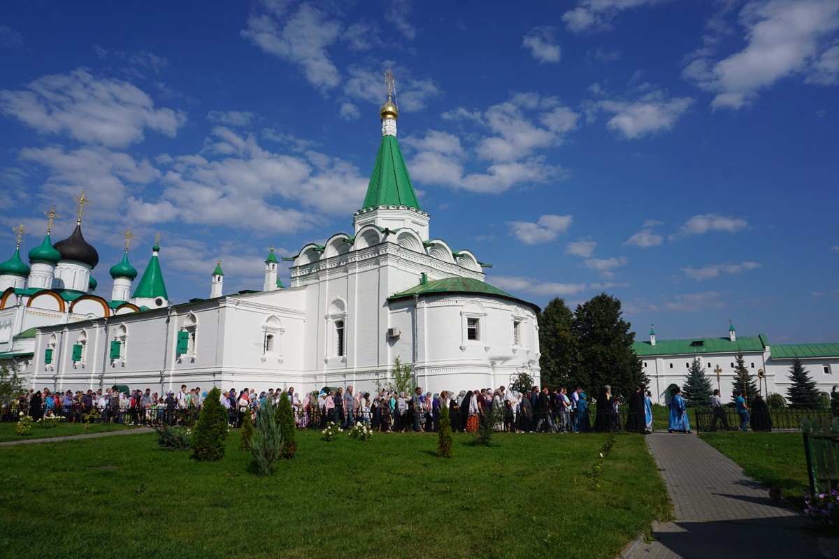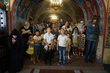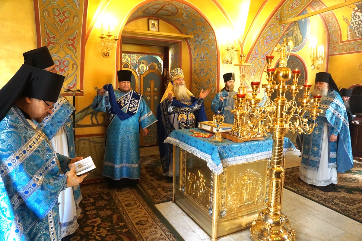 Под колокольный звон многочисленные прихожане и паломники, окропляемые святой водой, обошли храмы обители. При возвращении в Успенскую церковь вместе с народом было пропето песнопение «Царице Моя Преблагая…» По окончании крестного хода братия монастыря во главе с игуменом проследовали в братскую трапезную, где был совершен «Чин о Панагии».