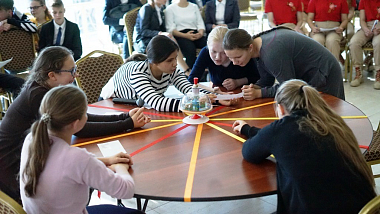 Встреча школьников в духовно-просветительском центре «София» под звуки песен военных лет началась с экскурсии в интерактивный музей «Малоярославец – город двух побед». Перед началом экскурсии ведущая клуба интеллектуальных и творческих игр духовно-просветительского центра «София» посоветовала ребятам внимательнее слушать экскурсию, так как часть вопросов турнира основаны на том, что должны рассказать экскурсоводы о защите Ильинских рубежей. Многие из участников турнира именно благодаря этому предупреждению были готовы дать ответ на некоторые, особенно сложные вопросы.