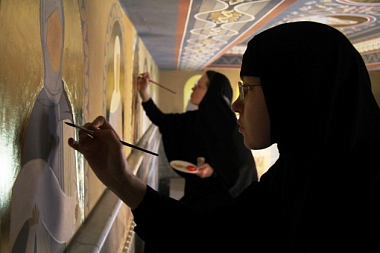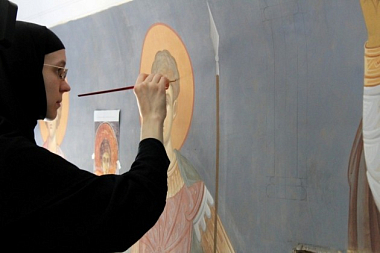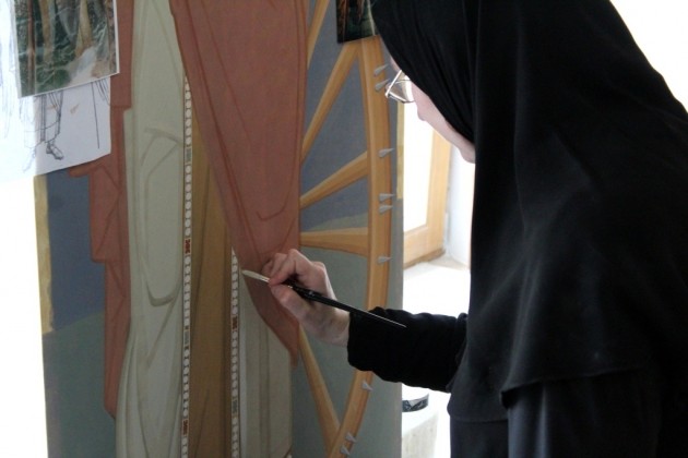 Иконописная мастерская также представит на выставке копии с древних фресок, выполненные сестрами во время учебных поездок в Сербию и Македонию. Сестры посещали храмы святого великомученика Георгия в Старо Нагоричино (Македония) и святых Богоотец Иоакима и Анны в монастыре Студеница (Сербия), где сохранились фрески XIV века, выполненные в лучших традициях византийской иконописи. В этих храмах сестры в течение нескольких дней с раннего утра до позднего вечера изучали фрески и делали копии. На выставке можно будет увидеть эти работы: образы Пресвятой Богородицы, святого евангелиста Марка, святителя Василия Великого и другие. Сестры постарались в точности повторить цветовую гамму и иконографию древних фресок. На выставке также будут представлены рисунки и цветовые эскизы росписей двух монастырских храмов: собора Александра Невского и храма Божией Матери «Всех скорбящих Радость». Эти работы наглядно показывают сложный процесс создания росписей.
