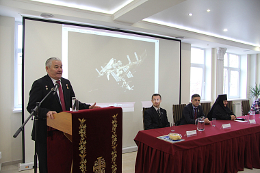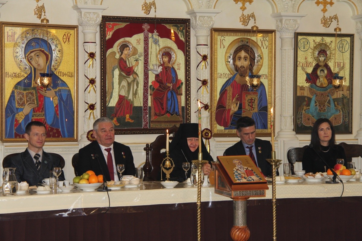 Объявив открытие школьной научно-практической конференции «Космос зовет», Игумения Николая передала слово старшему из гостей космонавтов В.Г. Корзуну. Валерий Григорьевич как замначальника Центра подготовки космонавтов им. Ю.А. Гагарина и начальник отряда космонавтов ЦПК им. Ю.А. Гагарина рассказал участникам конференции о своем личном опыте подготовки к космическим полетам, проиллюстрировав рассказ фотографиями с Международной космической станции и из Звездного городка, и перешел к центральному вопросу, который связывает организатора мероприятия — монастырь и тематику конференции. «Космос и Православие» — так назывался доклад и презентация героя-космонавта для школьников, педагогов района и сестер обители. Валерий Григорьевич рассказал о традициях освящения космического корабля на космодроме, посещения не только российскими, и зарубежными космонавтами и перед полетом Троице-Сергиевой Лавры, о традиции получать благословение накануне полета, от которого не отказываются даже космонавты других вероисповеданий. Поведал о Юрии Гагарине и его отношении к вере и Богу, о святынях — иконах и мощах святых, побывавших в космосе… О снимках из космоса, о своем общении по любительской радиосвязи с монахом из афонского монастыря Дохиар, о духовнике российских космонавтах игумене Иове из Троице-Сергиевой Лавры, настоятеле Преображенского храма в Звездном городке. Завершающим аккордом в докладе стал 3-хминутный фильм о красотах нашей планеты, как они видятся с Международной космической станции — зеленые всполохи северного и южного сияний, огни крупных и малых городов, синева океана и морей, белизна заснеженных хребтов гор — с огромной скоростью с высоты 400 километров.
